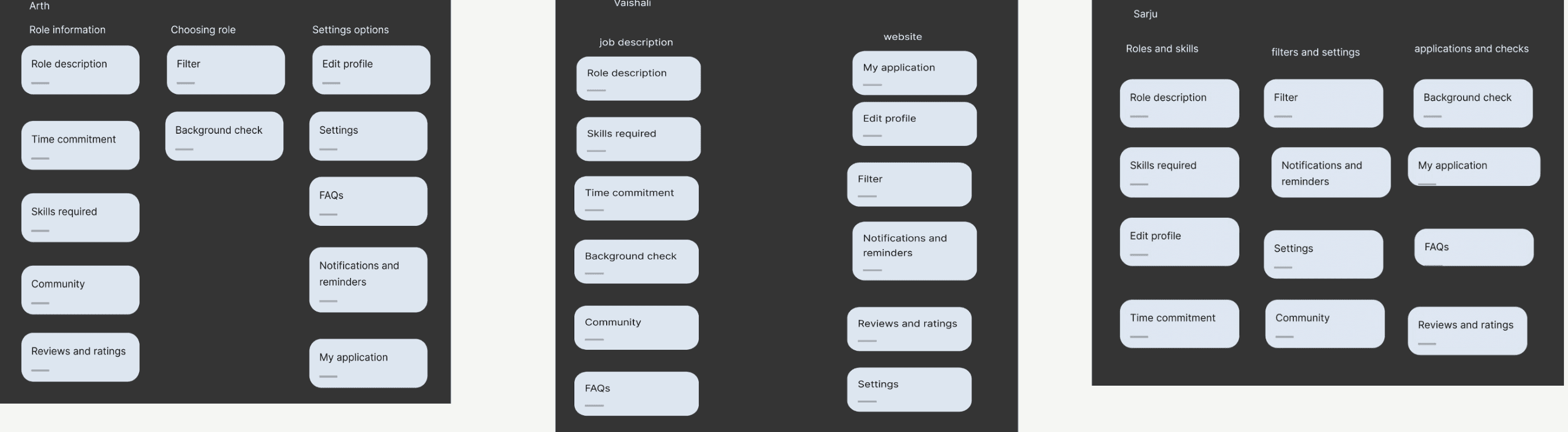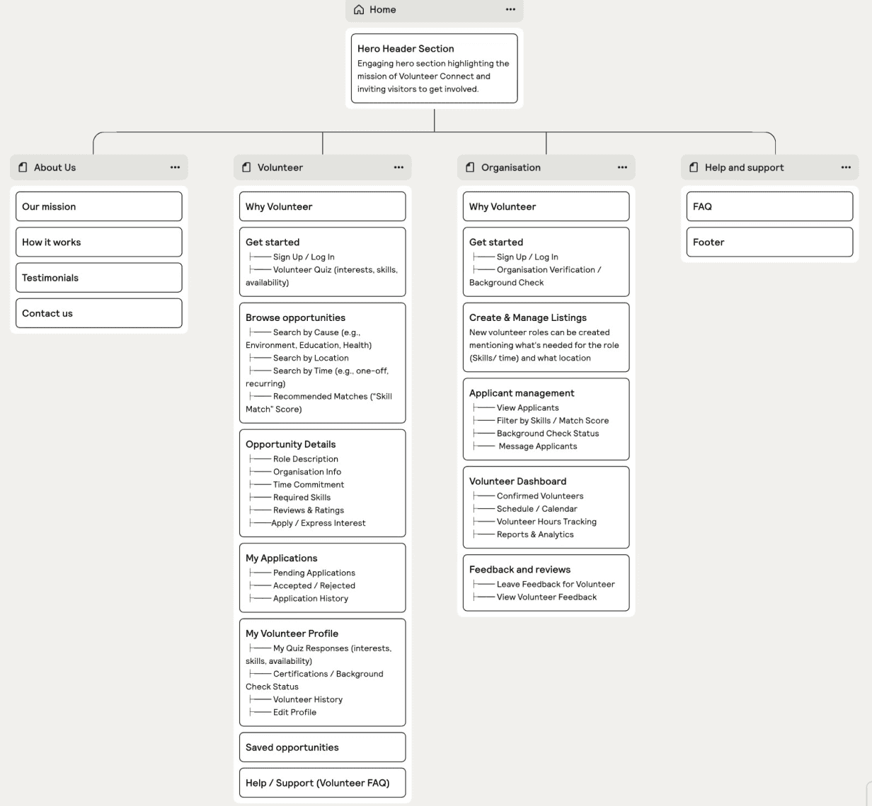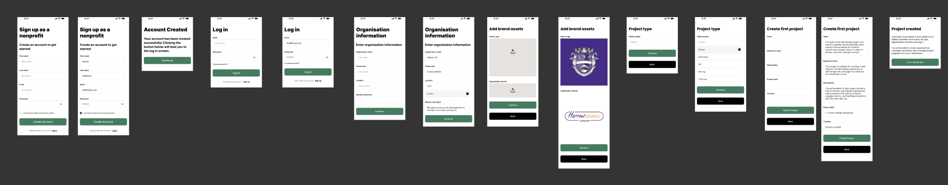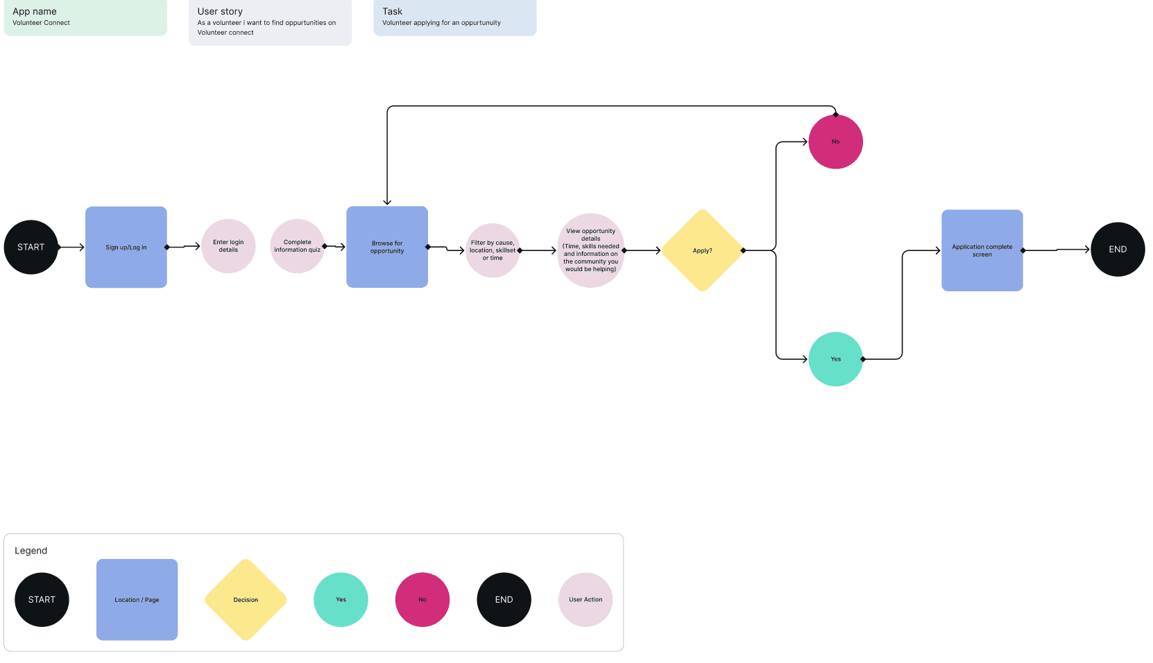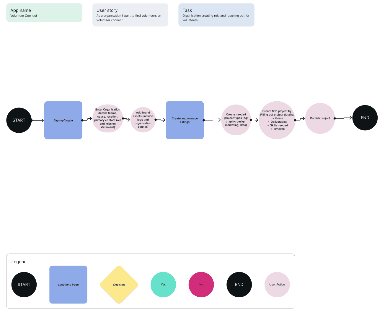 For this UX design course, the 8 week timeline required a focused scope, so we designed two core task flows: one for volunteers applying for a role and one for organisations listing a role. These flows were prioritised to address the most critical user journeys within the project timeframe.