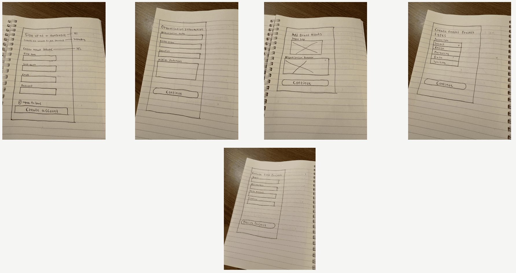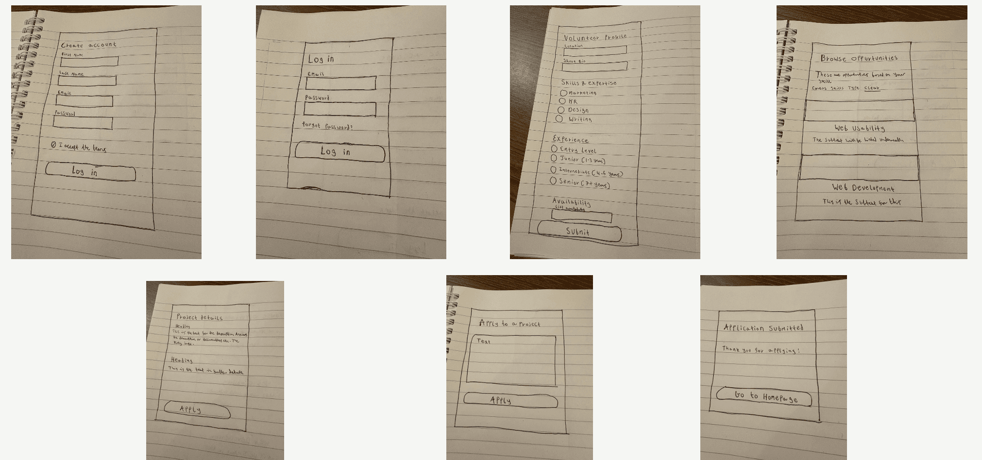 Upon create these flows, I created low fidelity sketches to showcase roughly what I thought this would all look like. This is a sketch of what the volunteer flow would look like.