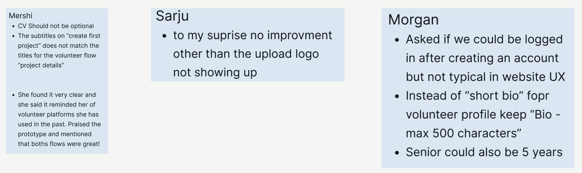 I received very little comments for improvement with these 2 flows, all 3 participants stated they found the flows very easy to use with very little difficulty. The only comment that really striked out to me was that the content for “create your first project” in the organisation flow did not line up with the "project details" screen volunteers would see when applying for a role.