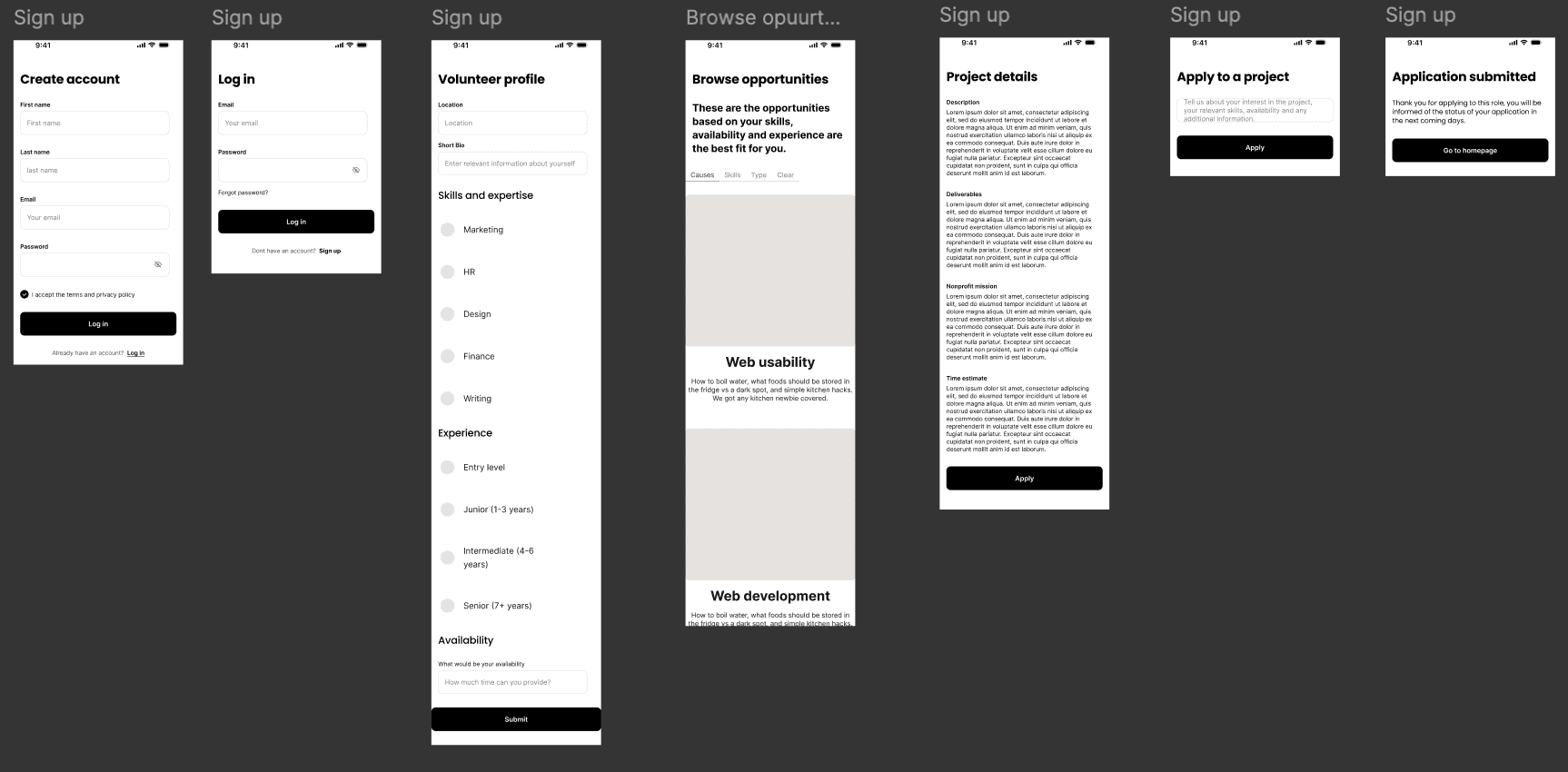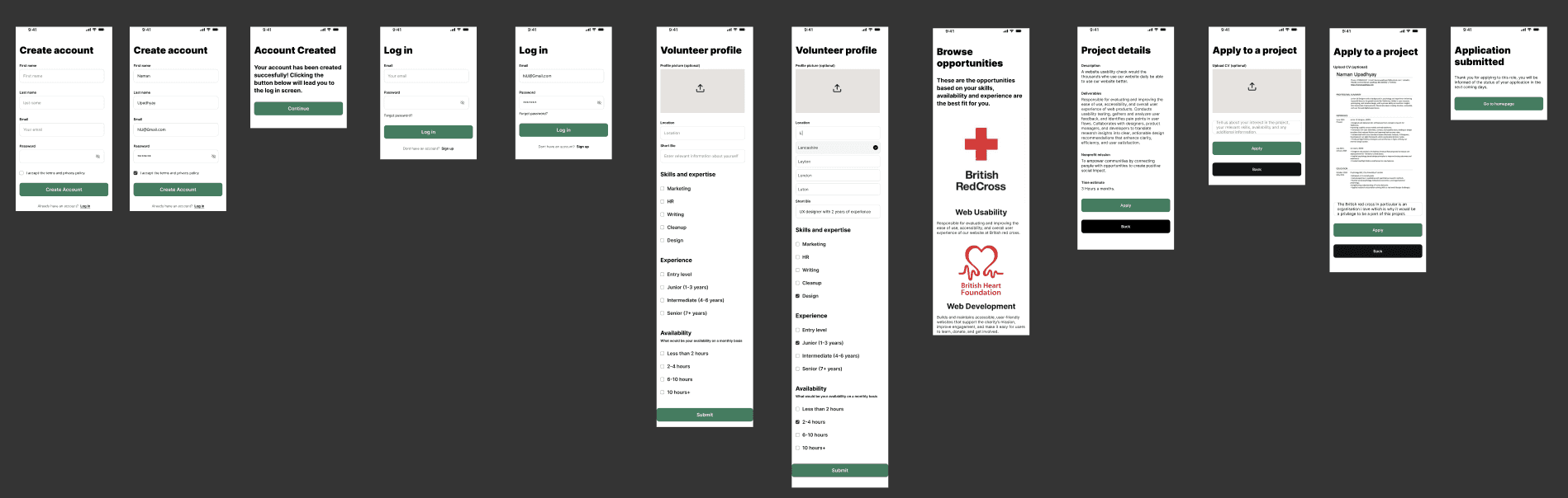 Taking into account all of the feedback given by the participants, this is what the high fidelity volunteer flow looks like.
