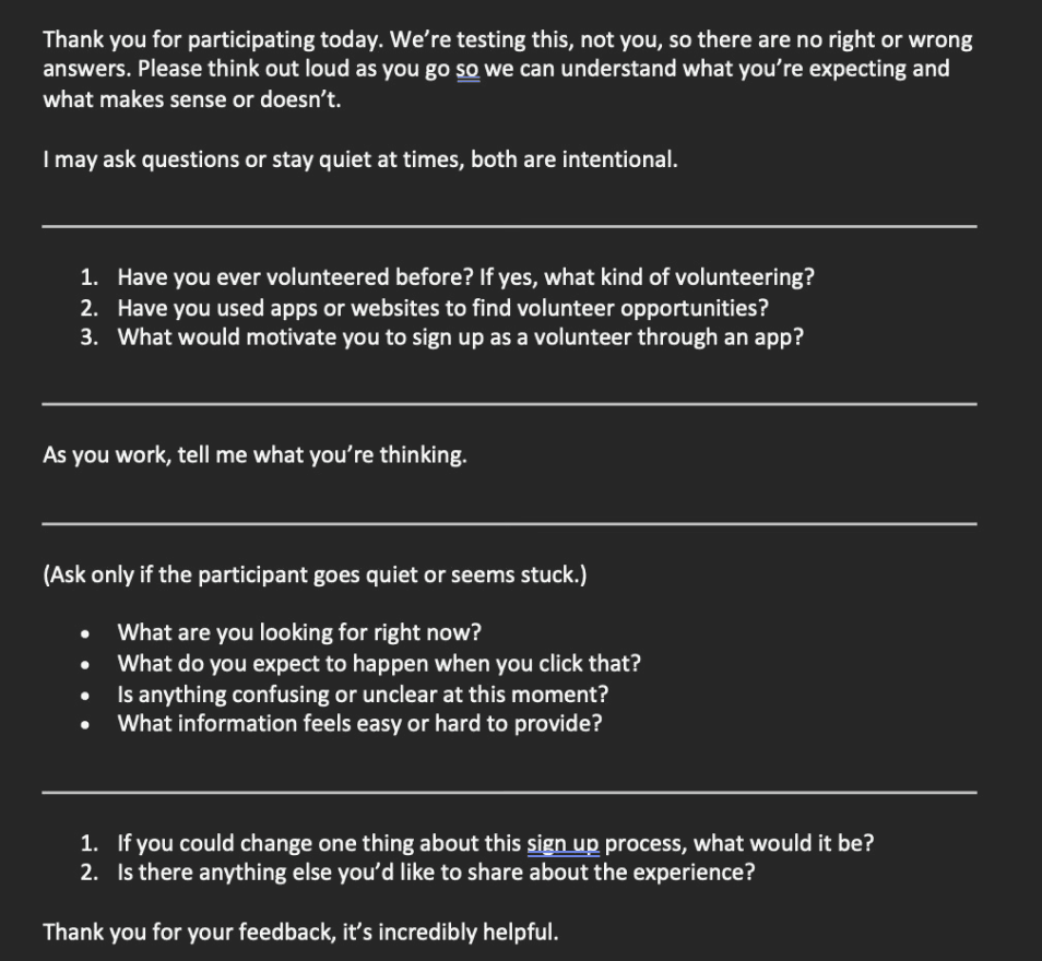 Usability testing was conducted on the mid fidelity wireframes to evaluate whether both volunteers and organisations could successfully complete their tasks on Volunteer Connect in a way that makes sense to users. This was the script used for the usability tests.